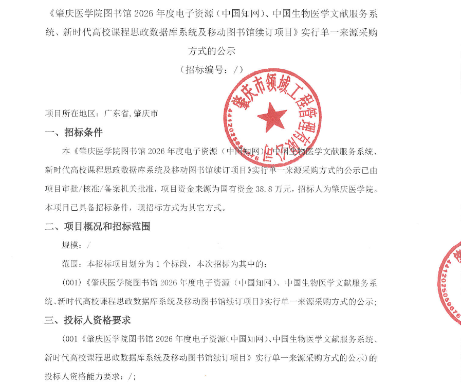 上一条:肇庆医学院图书馆2026年度纸质中文期刊征订及配送项目询价公告 下一条:肇庆医学院2026年度公务用车加油服务采购项目竞争性谈判公告