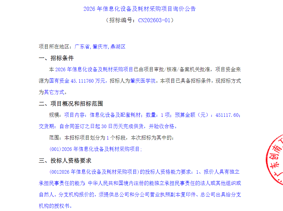 上一条:肇庆医学院科研采购平台技术及服务项目[ZJZB-2026-12183]-招标公告 下一条:2026年度学校宣传物料及相关服务采购项目招标公告